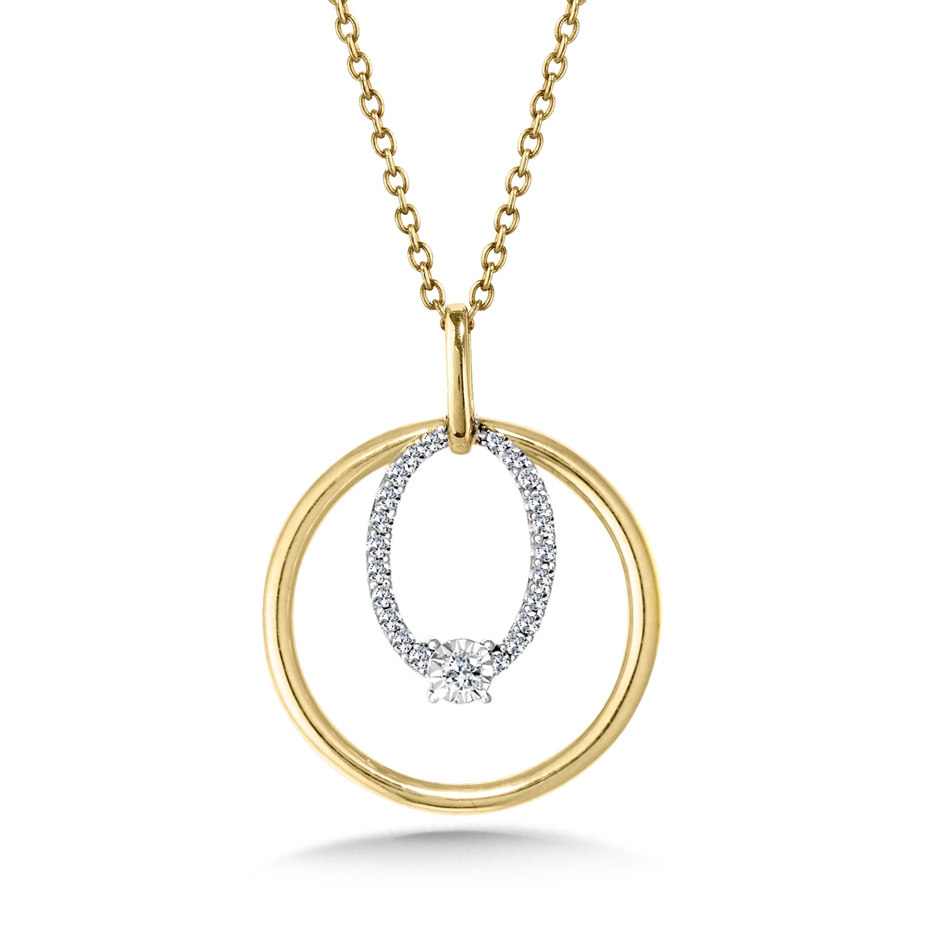 A striking geometric design defines this pendant necklace, featuring concentric circles crafted in 10-karat yellow gold and adorned with diamonds totaling 1/12 carat. The interplay of nested circles creates visual depth and modern sophistication, while the warm gold and sparkling diamonds deliver an understated yet captivating piece suitable for both refined everyday wear and special occasions.